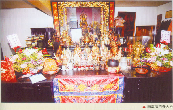 南海法门寺为叶德成居士所创建,缘於叶居士年轻时因鼻子问题,屡次开刀始终下愈,在机缘下,於延平北路以500元请到一尊由福州工匠雕塑之观音像回家供奉。未久,鼻病竟不药而愈。