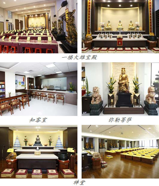 精舍占地两百坪,古朴庄严的大雄宝殿,除供奉三宝佛外,更有四大天王及韦驮、伽蓝菩萨的护持,在此举办法会时,仿如万德庄严的佛国世界。三楼除肃穆的大禅堂外,另有小参室,方便学员请法。四楼是图书室及儿童室,地下一楼则有斋堂与大寮。精舍法务日益兴隆,除各级禅修班、儿童禅修班外,亦开办书法、中华花艺、素食烹饪等才艺课程。此外,每月邀请家长参与“亲子共读”读书会,以促进亲子关系与家庭和谐,并启发儿童心智与善根。
