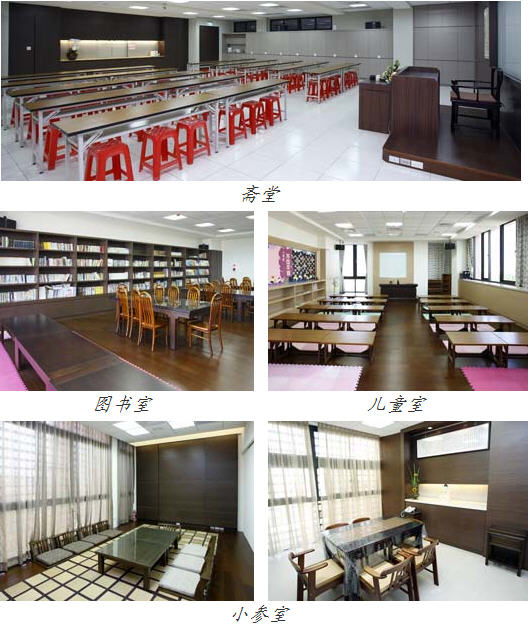 精舍西行约百余公尺即达龙潭市区。这栋闹中取静、庄严静谧的新颖建筑,面向宽广的运动公园,视野辽阔,每日清晨迎接着朝阳,益发显得宏伟壮观,引人注目。