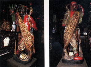 关渡宫年代久远,殿口的龙柱、石狮、壁雕等,都非常精巧,尤其是门神,用浮雕表现,和一般的彩绘方式有不同的韵味。进入殿内,殿顶的藻井、斗拱、梁椽都有很丰富的雕塑、彩绘,非常美丽。而拥有许多传说的妈祖神像,安坐在正龛上,神态慈祥,和她的部将千里眼、顺风耳的造形,形成了很强烈的对比。