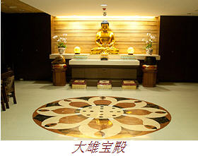 各项禅修课程、早课共修、法会活动都在此举行。佛龛中央供奉着三宝佛,右侧为观世音菩萨,左侧为地藏王菩萨。整体空间设计古朴简约,以木材的质感架构而成,予人沉静肃穆的感觉,让人进入禅堂即为沉静的环境所摄受,澄思绝虑,心境清凉。