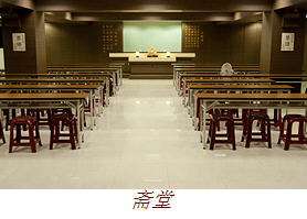 斋堂是大众用餐的场所,中间供奉笑口常开的弥勒菩萨,祈愿来精舍用斋的居士,皆能吃得健康,欢喜自在。