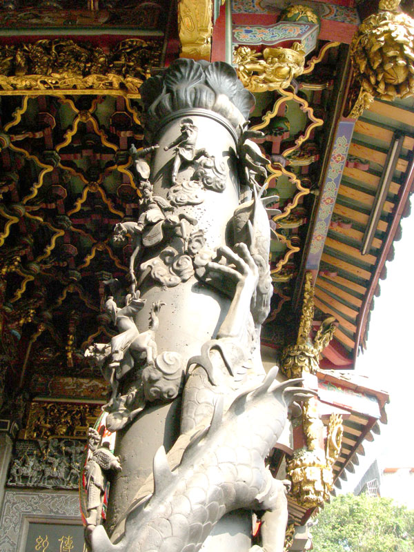 在广场上,请注意地板石材,其中切割较不整齐的部分,已有古老的历史。从前台湾海峡又叫“黑水沟”,风浪很大,移民都用石板来压稳船舱,以便能安全渡海来台,而这些石板,后来也就用来铺设龙山寺前的部分广场。再来,就从前殿开始欣赏。首先,可以看到殿前有台湾独一无二的铸铜龙柱,屋檐下的木雕、彩绘,也都非常生动。尤其用来支撑屋顶的“网目斗拱”,是台湾寺庙的首次创作。另外,大门左边的石雕窗上,雕有精彩的三国演义故事;右面则有一个八角竹节窗,上刻竹干,是“竹报平安”的意思。