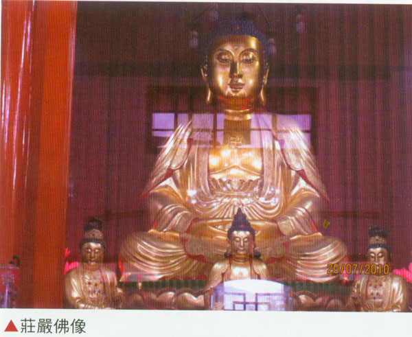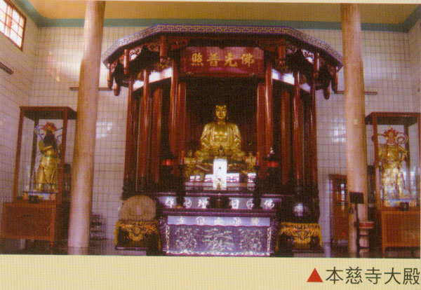 本慈寺建筑绿瓦、白墙、红柱,庄严肃穆。土楼前殿,供奉西方三圣一—南无阿弥陀佛、南无观世音菩萨、南无大势至菩萨,尊尊高达5尺5寸,配奉有药师佛等,左殿延寿堂另供观世音菩萨及延寿功德禄位,右殿功德堂则供地藏王菩萨与往生者功德禄位,修行及照护众生具备。2楼正殿供奉高达7尺2寸的释迦牟尼佛,前供奉释迦三圣——释迦牟尼佛、本师文殊菩萨、本师普贤普萨,左右韦驮护法、伽蓝护法亦高达5尺2寸,配合正殿挑高10余公尺,正中彩绘藻井为大小法轮、阳光四射、祥云围绕。四面白色磁砖墙面更使释迦三圣神与护法显像庄严,令人肃然起敬。神宠两侧设经书柜,藏经丰富,给修行者莫大方便。