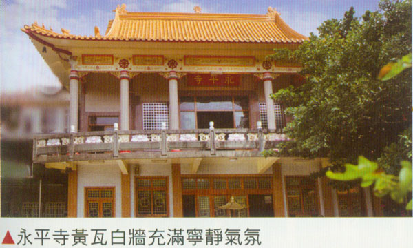 永平寺占地约600坪,为歇山式屋顶,上覆金黄色琉璃瓦,1楼为圆通宝殿,供奉观世音菩萨:2楼为大雄宝殿,供奉释迦牟尼佛。