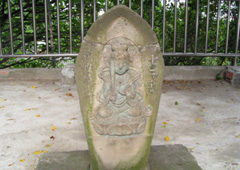在大雄宝殿前有新盖山门一座,当来下生弥勒佛正喜孜孜地笑脸迎人,绕至背后有一立姿韦陀护法,双手合十有一杵横卧其中,庄严肃穆,全身漆金,新式的山门的琉璃瓦和大雄宝殿的黑瓦,相当突兀不协调,有种格格不入的感觉。继续沿阶而上,有一木造之小亭,其上供奉的是悠雅坐姿的圣观自在菩萨,全身上下由粗石雕刻而成,虽谈不上精致采丽,却是古朴有致,浑然天成。背后有书写在大理石上的赞文,其笔法似行草,笔者眼拙,有些字体看是不懂,赞文曰: