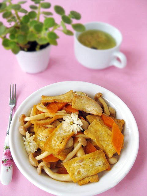 材料:北豆腐1小块 白玉菇一小盒 胡萝卜1个 黄山贡菊6朵