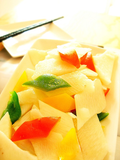 做法:太简单了。先用洋葱丁爆锅,再下山药、彩椒炒,看火候到了就加盐、蘑菇精、醋,然后就出锅了。