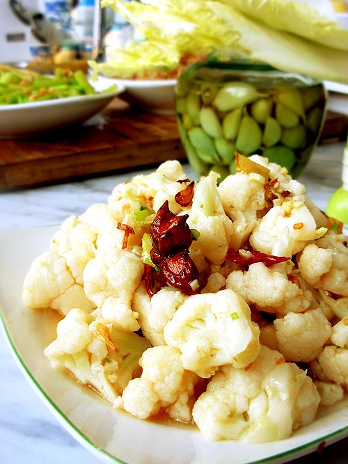 3 把炸好的油倒入菜花中,再加适量盐、少量糖、蘑菇精、少量米醋,拌好就可以装盘了。