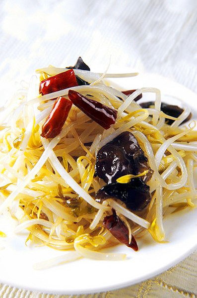 原料:绿豆芽1斤,干辣椒,盐,酱油,醋,糖,食用油适量