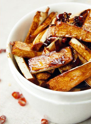 材料:茭白400克、干辣椒10克、花椒20粒、深色酱油(老抽)1茶匙(5ml)、糖1茶匙(5ml)、盐适量、油。