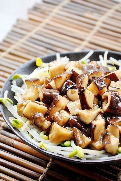 7、约摸七八分钟后,加入1/2勺素蚝油,撒上黑胡椒,转大火收汁。汁儿不要收得太干,留一点比较好,因为我们要浇在豆芽上,将香菇丁和芡汁一起浇在已码在碗中的豆芽上,即可。