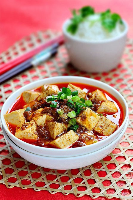 2、锅中入比炒青菜略多点的油,加入豆瓣酱,小火慢炒,至豆瓣酱香味浓郁,油色红润,倒入辣椒粉继续小火慢炒到辣椒香味浓郁后,倒入豆豉炒出香味,加入豆腐,倒入素高汤或水,烧3—5分钟,然后用淀粉勾芡,视汁浓亮油时盛碗内,撒花椒粉即可。