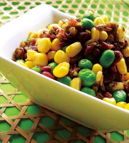 材料:做馅剩下的绿豆皮、红豆皮、甜香玉米粒、青豆粒、素蚝油。