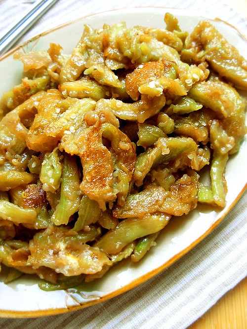 5等面煎成金黄色,略有一点糊也可以,这样比较香,就把茄子翻过来煎。等这一面也达到另一面的成熟度,再翻炒几下,让茄子形成单独的一块块的,就可以出锅啦。