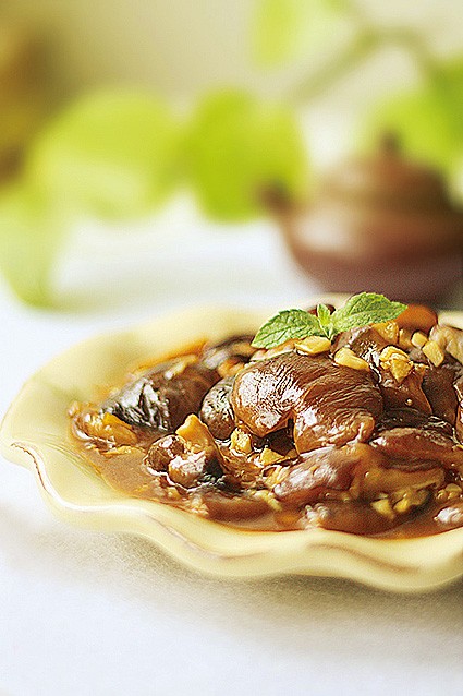 3、炒锅加热橄榄油,加香茹翻炒,将调好的汁水倒入锅,水开后转中小火,加锅盖焖至汤汁基本收尽即可。