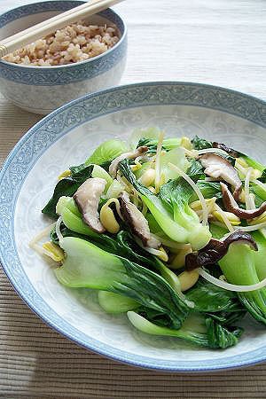 将黄豆芽去掉根须,洗净;小油菜择洗干净;鲜香菇洗净,沥干水分,切片;老姜切成细丝。炒锅烧热,放油,爆香姜丝后,放香菇煸炒一会,出香味后放豆芽、油菜翻炒,等油菜变软,就可以关火。最后放盐,拌匀,就大功告成了。