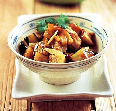 5. 锅留底油,下入花椒粉、姜米炒一下,将茄子复倒入锅内;