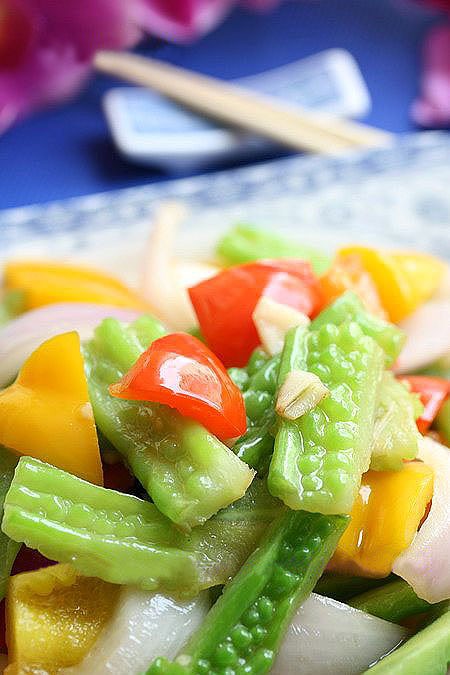 做法:苦瓜用刀子贴着中间白色硬芯的部分削下。削成块状,这个削的时候要小心,削的多了,白色硬芯部分也带上去了,就失去了削的意义。彩椒或青红椒伴切块。起油锅,下原料炒熟调味即可。
