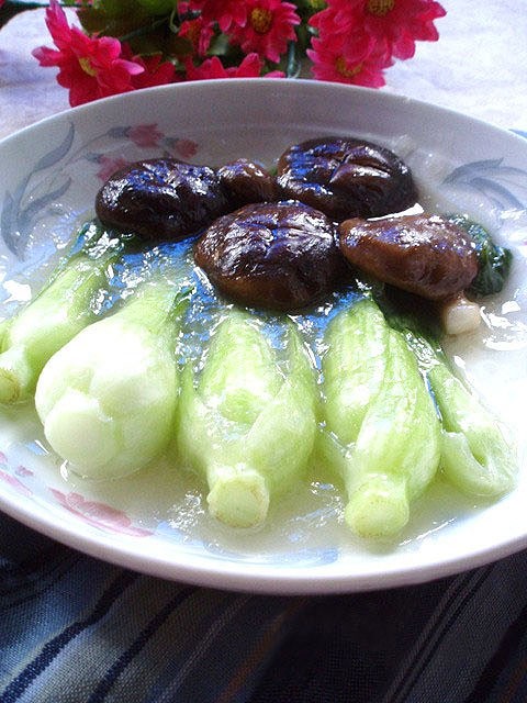 2、把青菜和香菇稍微焯一下水,青菜捞出立即放入冷开水;