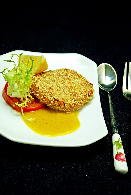 (7)用咖喱粉,烧成咖喱酱汁,倒入盘内。再饰以柠檬角、蕃茄片、西生菜配搭,最后放入芝麻土豆蔬菜饼,即可上桌。