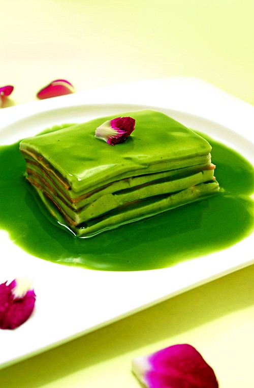 (4)取一小碗素上汤,倒入锅中加热,调味加盐、蘑菇精(注意咸淡,前面加过盐),放入抹茶粉拌匀,勾薄薄的米汤芡,淋在豆腐之上即可。