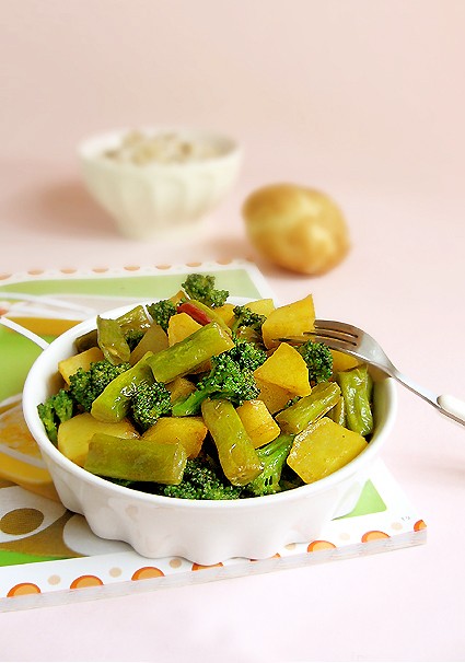 材料:土豆300克、西兰花150克、四季豆100克、咖喱粉20克、干辣椒少许、盐2克