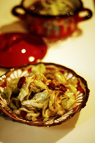 4,待油烧得极热后,放入包菜,快速翻炒均匀。放入3和干辣椒,撒盐和米醋。