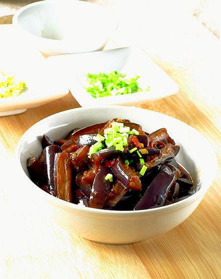 材料:茄子、泡红椒、姜、四川豆瓣辣酱、酱油、糖、香醋、淀粉。