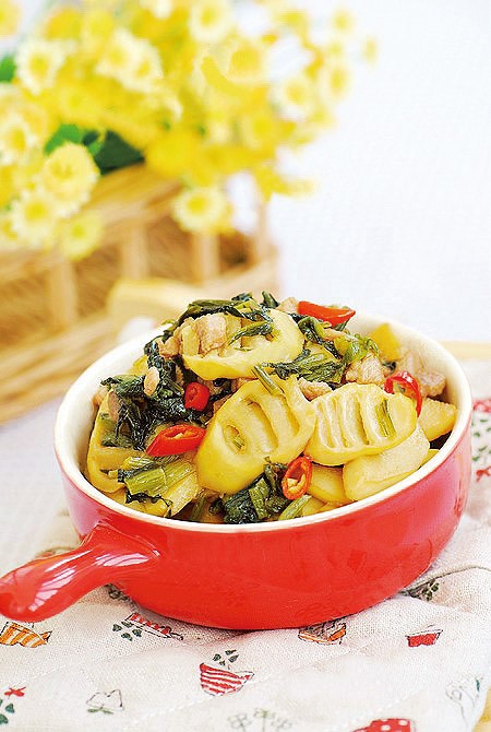 6.倒入春笋、雪菜和辣椒,转中大火翻炒片刻。然后调入白糖、香油、盐