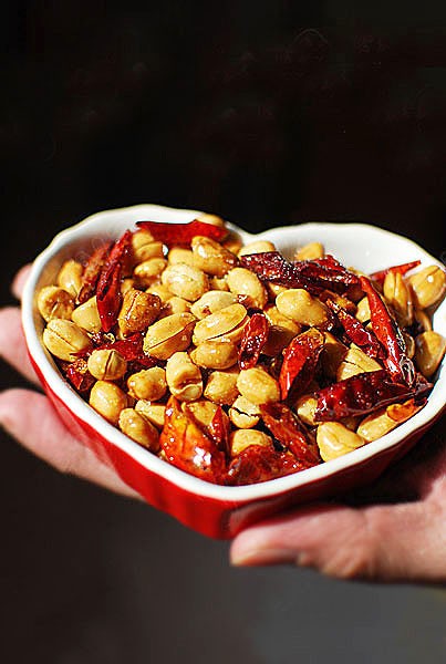 6、锅内把油烧温热,倒入冷冻的花生米,中小火慢慢炸至花生米向上漂,锅内有哗哗的响动捞出;油再次烧热,倒入花生米复炸至金黄,立刻捞出沥去油;