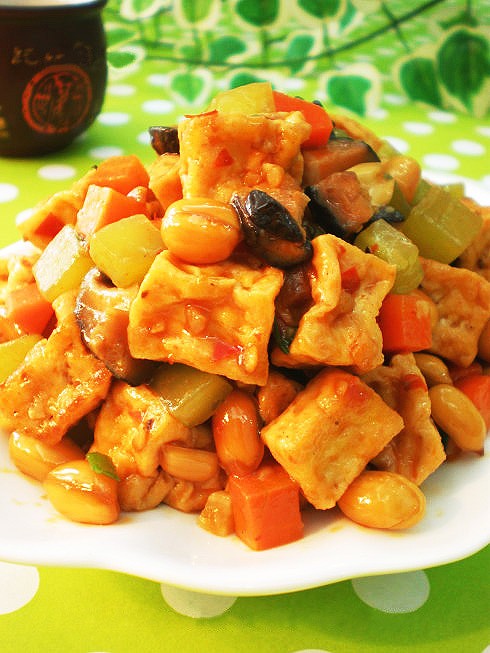 主料:老豆腐350克,花生米60克,莴笋80克,胡萝卜80克,香菇50克;