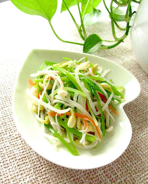 材料:香芹、金针菇、黄豆芽、胡萝卜等。