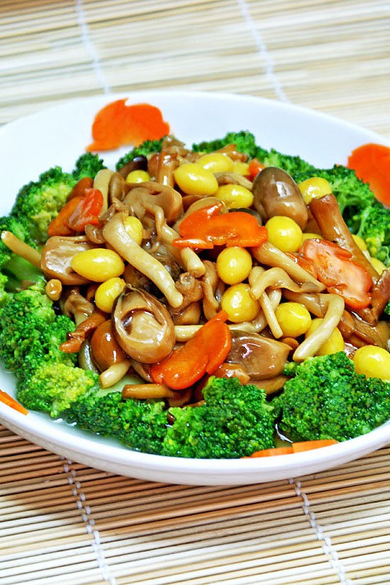 (8)净锅内加入少许精制油,放入滑子菇、草菇、秀珍菇、胡萝卜、银杏煸香,加水、素蚝油、老抽略煮一会儿,加素易鲜(代替味精)炒匀勾一点点薄薄芡,出锅,倒在炒熟的西兰花围成圆圈中。