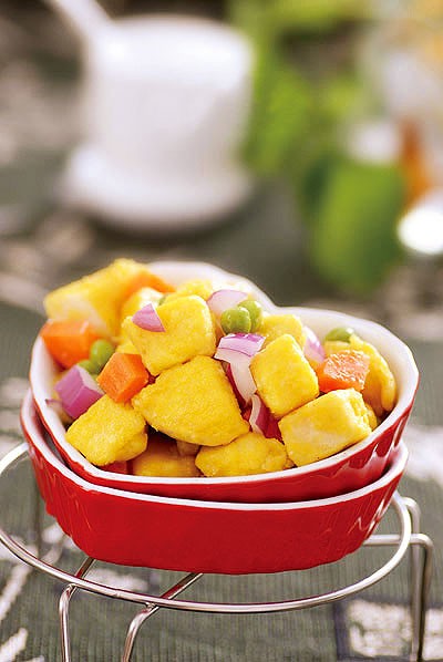 原料:中等大小馒头1个、胡萝卜半根、青豆少许、花生油、盐少许。