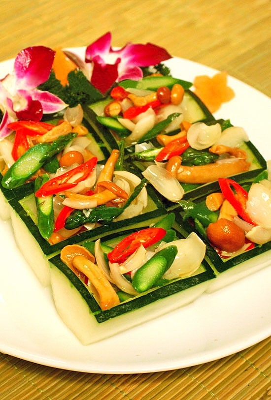 原料:冬瓜、百合、芦笋、滑子菇、红尖椒、麻油