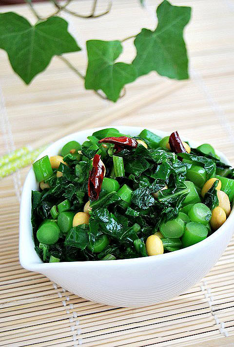 7.8.将干辣椒倒入略炒后关火。再下入芥兰和黄豆,放入“调料”拌匀即可。