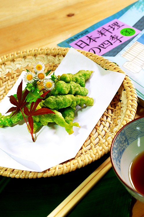 3.起锅,锅中加精制油,待油温升到4成左右,将平菇条放入步骤(2)制成的抹茶脆浆糊中滚一下,然后分别放入油锅去炸,炸熟捞出,然后升高油温重新放入油中复炸,炸成翠绿金黄捞出沥干油,装盘即可。