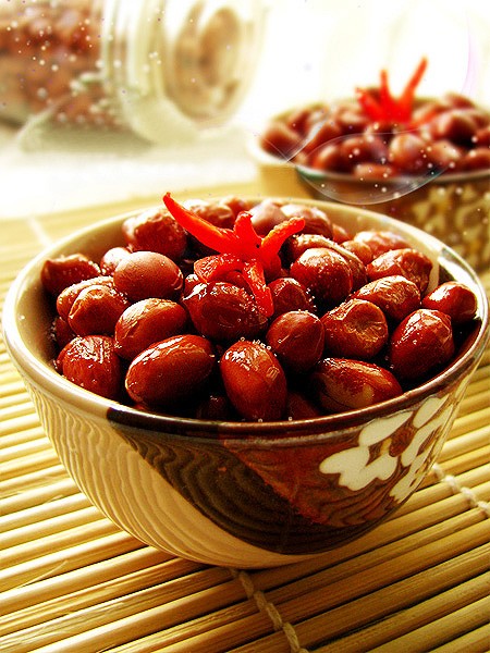 2:再入油,开小火不停翻炒,听到花生米噼啪响声稍密集、花生有少量脱皮的时候,关火。