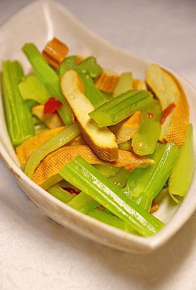 2、炒锅里放少量植物油,烧热后先下剁椒和姜末炒出香味,然后放入香干,加少量生抽炒一会,再放入焯好的西芹,略微翻炒几下,加盐调味即可出锅了。