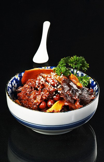 (6)锅留底油烧热,放入姜块煸香,放入茶树菇、花生米、烤麸、竹笋片以及酱油、糖、加水大火烧开调小火慢慢焅。至烤麸回软,开大火收卤汁 ,加蘑菇精,不勾芡捞出姜块淋少许香油,出锅装盘即可。