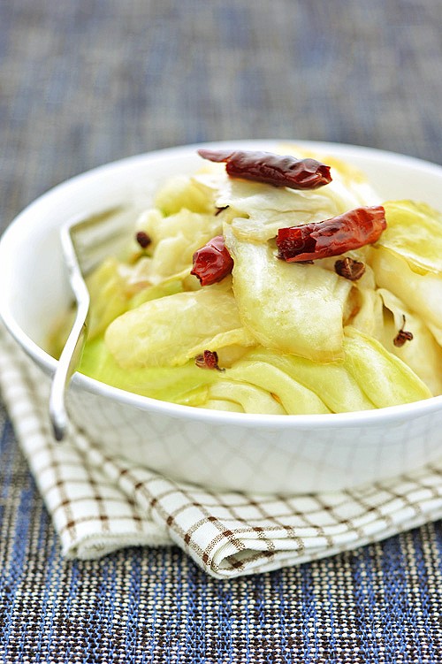 3)闻到花椒和辣椒的香味后,倒入沥干水的圆白菜,改成大火煸炒,待菜叶有点变软后(约2分钟左右),烹入米醋,加入糖和盐,快速翻炒菜熟后,再淋入一点点米醋即可。