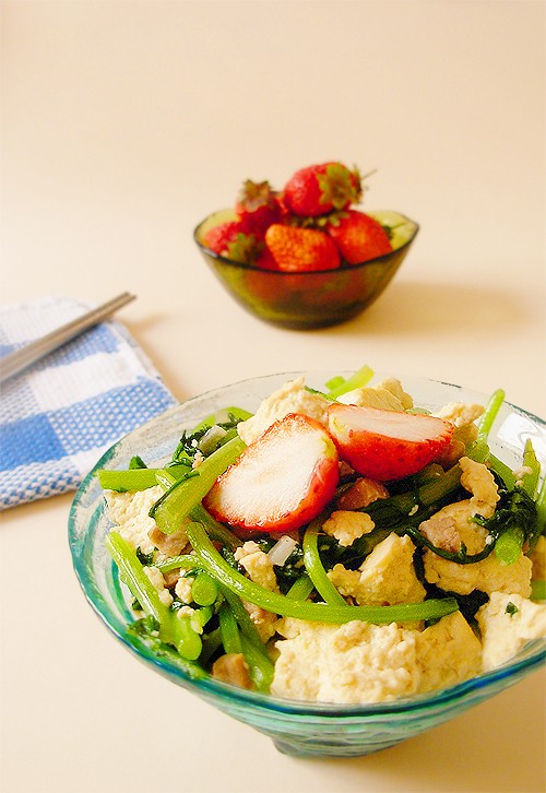 3 加豆腐炒。小心点翻。看茼蒿熟了,就可以加盐、蘑菇精、白胡椒粉,出锅。