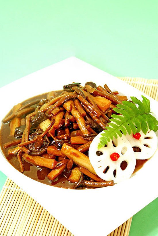 (4)锅留底油烧热,放入姜块煸香,倒入茭白、茶树菇,再加老抽、糖、和适量水,用小火焖烧,微火慢慢烧2小时左右。然后捞出生姜块,改用大火收至水分,加蘑菇精(代替味精)快要收干时勾一点点薄芡,淋些芝麻油装盘即可。