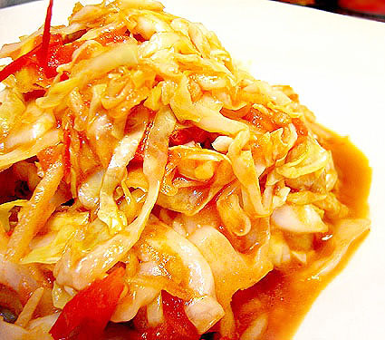 4、倒入包菜、盐、生抽、蘑菇精,炒熟后装盘即可。