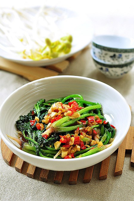 :菠菜250克、姜蓉1/2小匙、红泡椒3颗