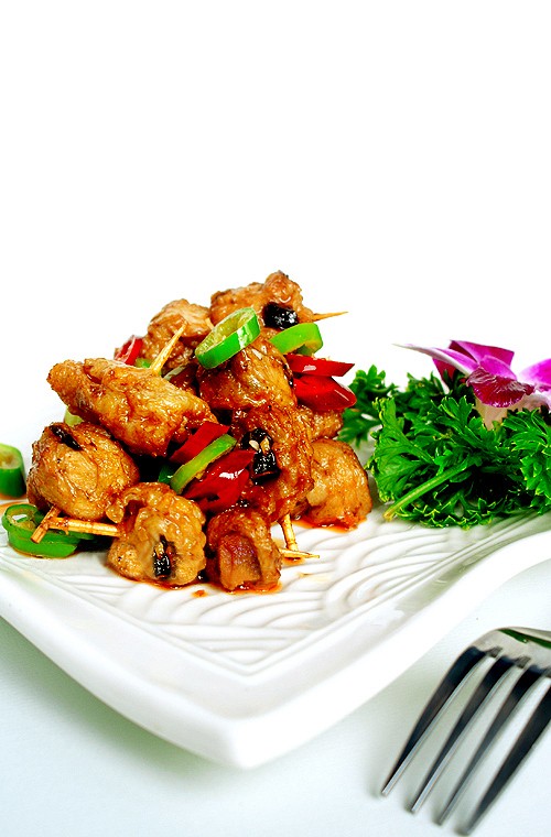 5.起锅,锅内加少许油,煸香豆豉,放入牙签面筋、少许生抽、糖、素易鲜调味,最后放入青红椒圈,淋少许香油、辣油,出锅装盘即可。