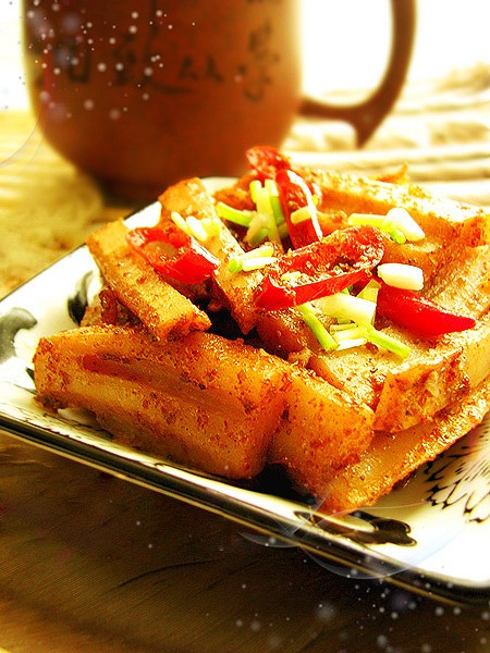 5:锅入油,小火炸香花椒和干椒,加入炒香后调入孜然和辣椒粉等烧烤调料。