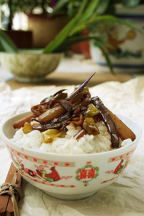 芋头花搭配茄子、辣酱炒制,是最家常的一种做法,当然味道也非常好吃。在云南当地用的都是昭通酱,颜色红润,口感微辣回甜,这种酱料在北京很多销售云南特产的商店就能买到,价格很便宜,实在没有的话用普通香辣酱,或者老干妈辣椒酱来做也不错。