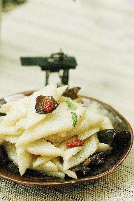 5.在锅中倒入油,放入姜丝爆香后先放入山药翻炒两三分钟,然后放入木耳,倒入泡过的枸杞。翻炒两分钟。
